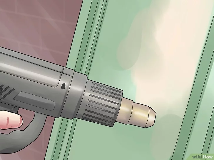 Bây giờ bạn có thể dùng một phương pháp dễ hơn tuy khá nguy hiểm. Bạn sẽ cần súng thổi hơi nóng. Đảm bảo đi găng tay, đeo kính bảo hộ, mặt nạ và chuẩn bị nước khi làm việc để đề phòng xảy ra cháy. Sau khi bật súng thổi hơi nóng, bạn cần đặt súng cách khoảng 15-20 cm bên trên bề mặt gỗ sơn.