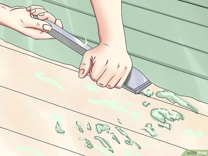 Khi lớp sơn cũ mềm ra vì nóng – bạn hãy cạo lớp sơn đã nhăn nheo. Dùng dụng cụ cạo sơn bản rộng để cạo khi lớp sơn bắt đầu nổi bong bóng và nhăn lại. Tiếp tục cạo từng phần nhỏ cho đến khi hoàn thành toàn bộ bề mặt đồ gỗ.
