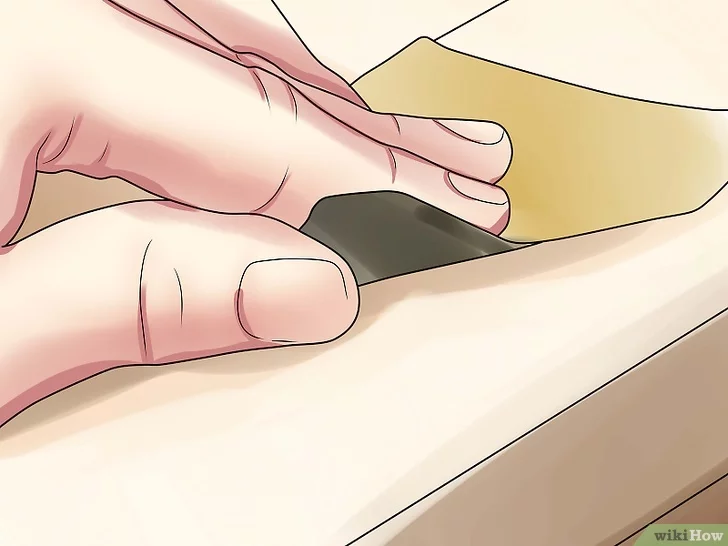 Mua giấy nhám loại tốt với hai lựa chọn: loại hạt thô cho công đoạn đầu tiên (để loại bỏ lớp sơn không mong muốn) và loại hạt mịn (để hoàn thiện công đoạn chà nhám, sau đó đánh bóng phần gỗ lộ ra bên dưới). Đầu tiên dùng giấy nhám thô, sau đó là giấy nhám mịn. Không chà quá mạnh, vì hiện tượng ma sát sẽ sinh nhiệt!