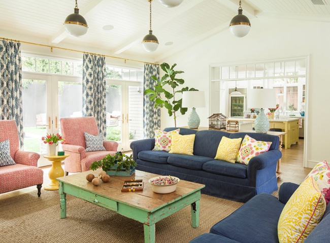 Không gian tiếp khách được bố trí với đủ các màu sắc khác nhau, màu tím than và màu hồng cam cho ghế, màu vàng, đen, cam cho họa tiết trên gối tựa. Bàn trà là một màu riêng biệt không liên quan đến ghế. Rèm cửa lại được chọn họa tiết xanh lục. Tuy nhiên, ai nhìn phòng khách cũng đều cảm thấy mát mắt và vui nhộn bởi sự không liên kết một cách hài hòa và ấn tượng này.