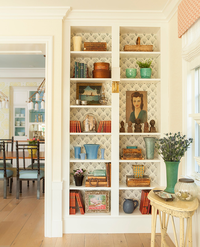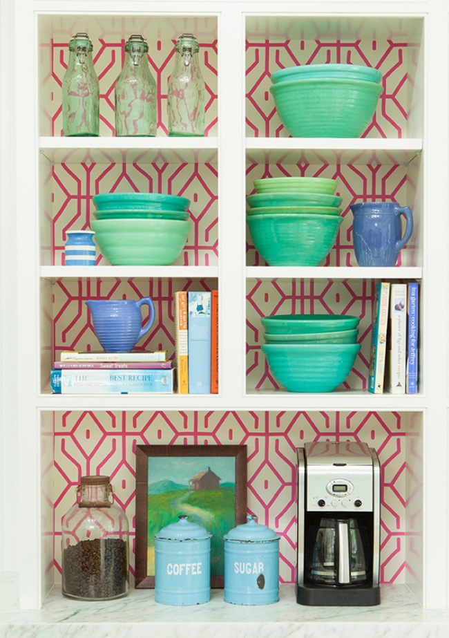Khu vực kệ để đồ trang trí được dán giấy dán tường phía trong làm màu nền cho những đồ lưu niệm bên ngoài thêm ấn tượng và bắt mắt.