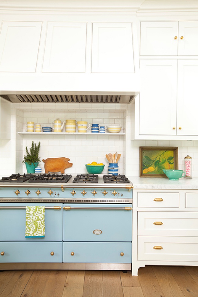 Khu vực nấu nướng đặt bên trong cùng của khu vực nên được chọn tông trắng sữa làm màu nền. Điểm nhấn từ màu xanh da trời pha ghi của tủ bếp cho không gian man mác vẻ đẹp đồng quê.