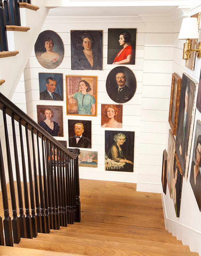 Cầu thang lên tầng hai được thiết kế đơn giản với điểm nhấn sinh động từ những bức tranh vẽ về các thành viên trong gia đình.