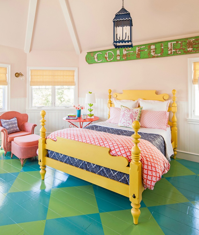 Không gian nghỉ ngơi được thiết kế với giường sơn màu vàng bắt mắt. Tường màu hồng giúp màu xanh của sàn thêm nổi bật. Những họa tiết ngẫu hứng của chăn ga và màu sơn sàn nhà mang đến nét đẹp sinh động và tươi vui cho phòng ngủ.