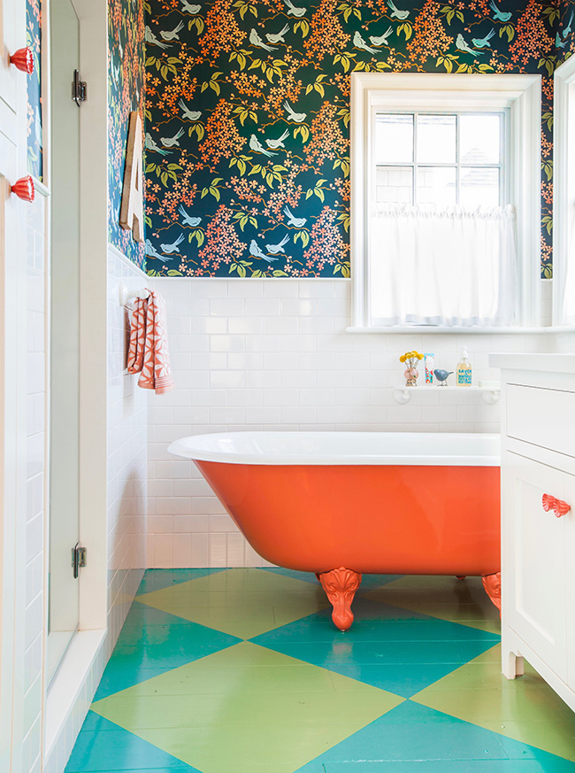 Khu vực thư giãn được bố trí cạnh phòng ngủ với sơn lát sàn cùng màu và họa tiết. Bồn tắm màu cam tạo điểm nhấn vui mắt cho không gian.
