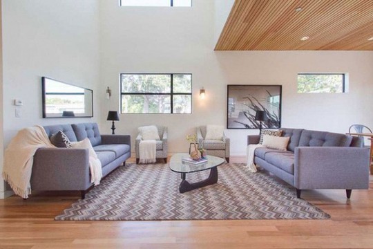 Phòng khách lớn với tông màu xám nhẹ nhàng kết hợp với thảm trải sàn có họa tiết hình học. Ngay phía trên tường của phòng khách chủ nhân ngôi nhà đã khéo léo thiết kế một cửa kính lớn để đón ánh sáng tự nhiên.