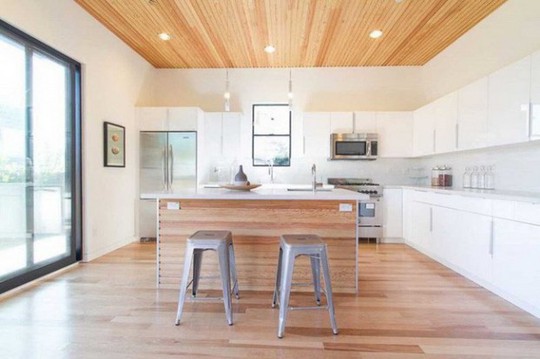 Trần nhà được chủ nhân thiết kế khá hiện đại với công nghệ lắp các bóng đèn con rải rác. Chất liệu gỗ công nghiệp được sử dụng ở đây để tăng hiệu quả hơn cho thiết kế.