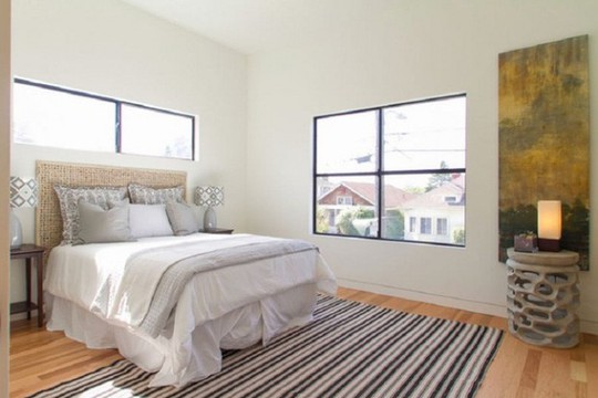 Phòng ngủ mang hơi hướng cổ điển một chút với điểm nhấn là thảm trải sàn sọc đen trắng. Tông màu sử dụng cho phòng ngủ cũng khá nhẹ nhàng mang lại được cảm giác thư thái cho chủ nhân.