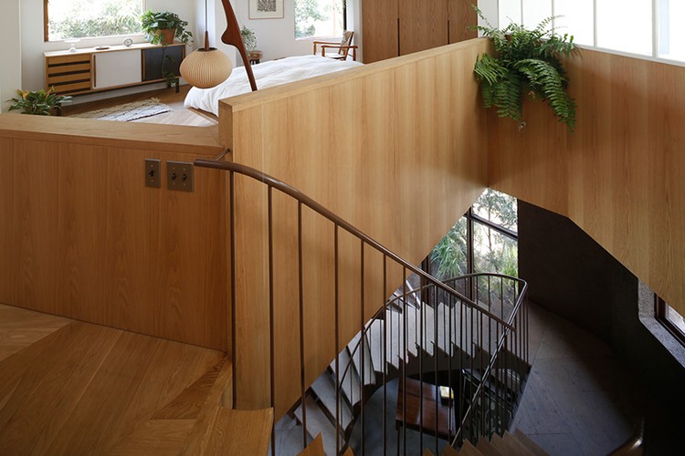 Cầu thang dẫn từ tầng trệt lên tầng trên của ngôi nhà được thiết kế đơn giản với lan can thấp, cho phép ánh sáng dễ dàng len lỏi vào sâu bên trong. Ảnh: Designboom.