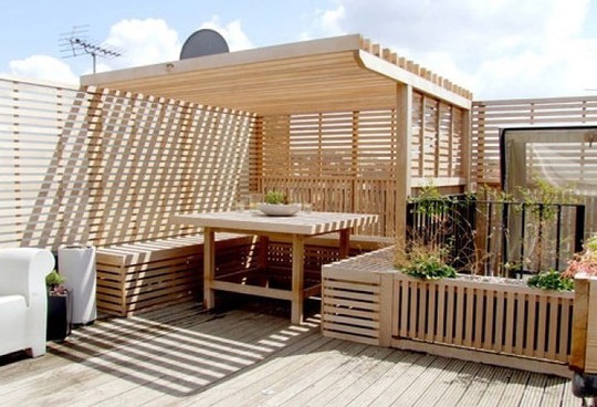 Mái che từ những thanh gỗ giúp giảm bớt lượng nhiệt đồng thời tạo nên những vệt nắng đẹp. Ảnh: Homedesignlover.