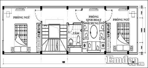 - Tầng 2 gồm có: Phòng sinh hoạt chung, hai phòng ngủ, hai phòng tắm.