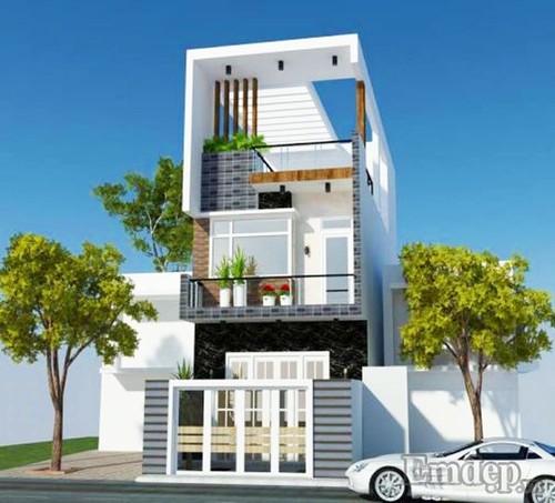 Trên nền sơn trắng chủ đạo, KTS sử dụng đá ốp lát màu tối với nhiều sắc độ để nhấn nhá cho mặt tiền từng tầng của ngôi nhà. Cửa và lan can kính đơn giản giúp ngôi nhà đẹp sang trọng mà vẫn tiết kiệm chi phí.